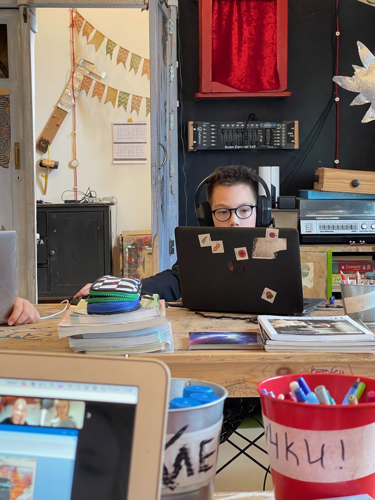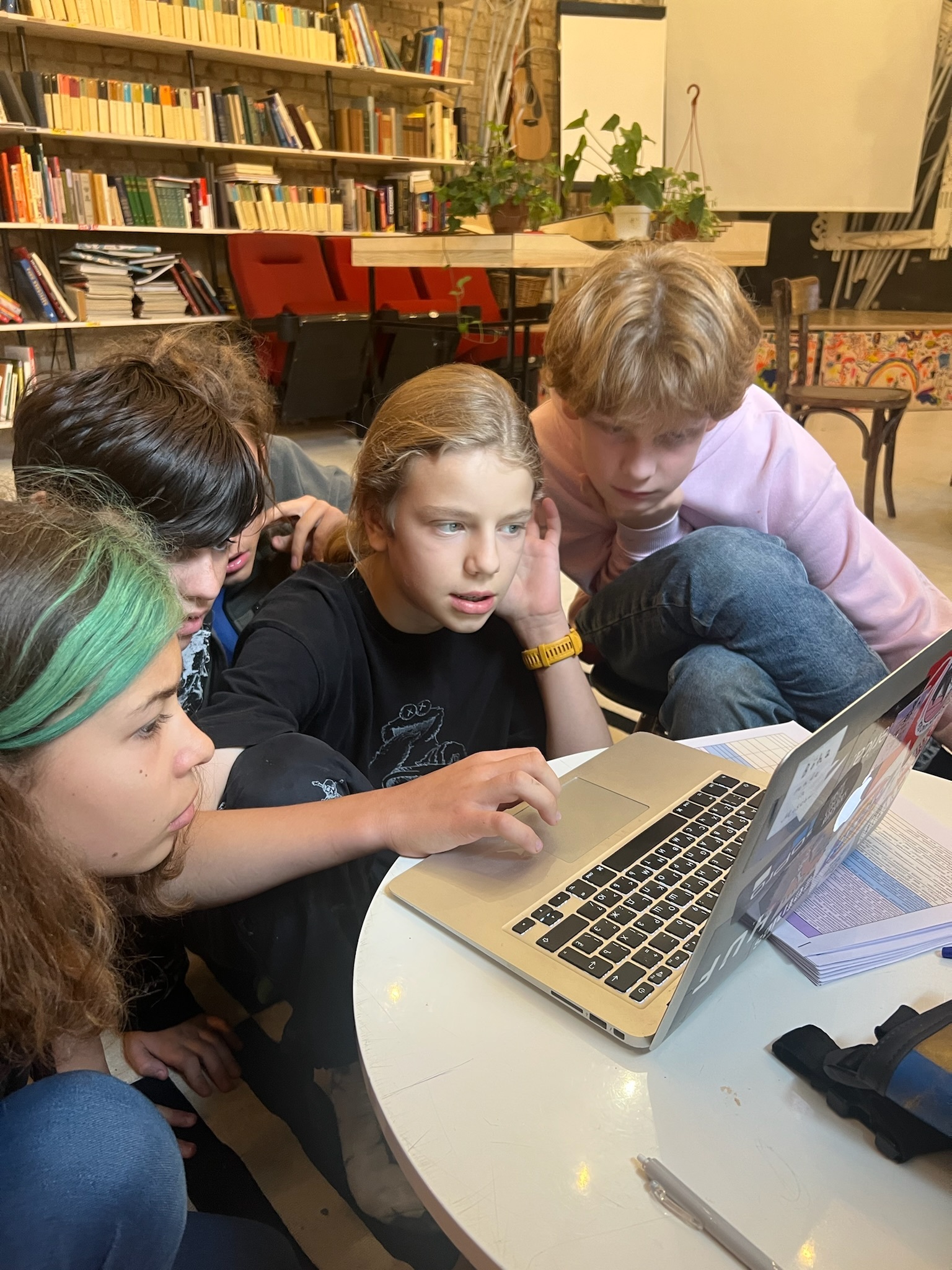 — Ещё тут есть отзывы родителей и мысли учеников о нашей школе. Если хотите их услышать, нажмите на пластинку (да-да, она крутится!).