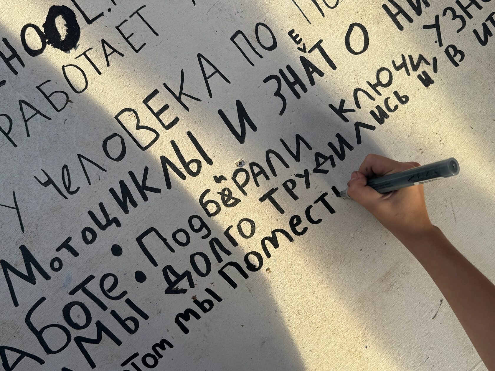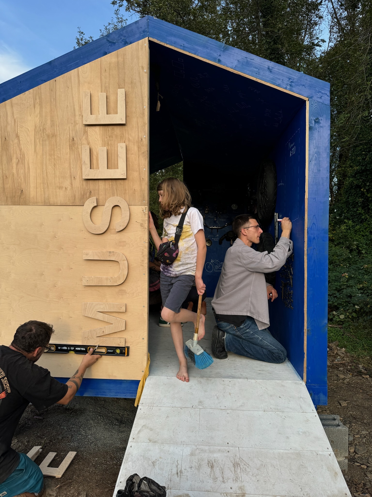 Чтобы разместить наш «музей», мы стали строить домик для разобранного мотоцикла. Помогал нам в строительстве этого объекта смелый и рукастый Максим (житель и работник Шато Шапито). Стены музея мы выкрасили в наш любимый цвет — синий. Потом немного пошалили вместе с ребятами и расписали потолок и пол: строчили послания, вещали красками историю покупки мотоцикла.